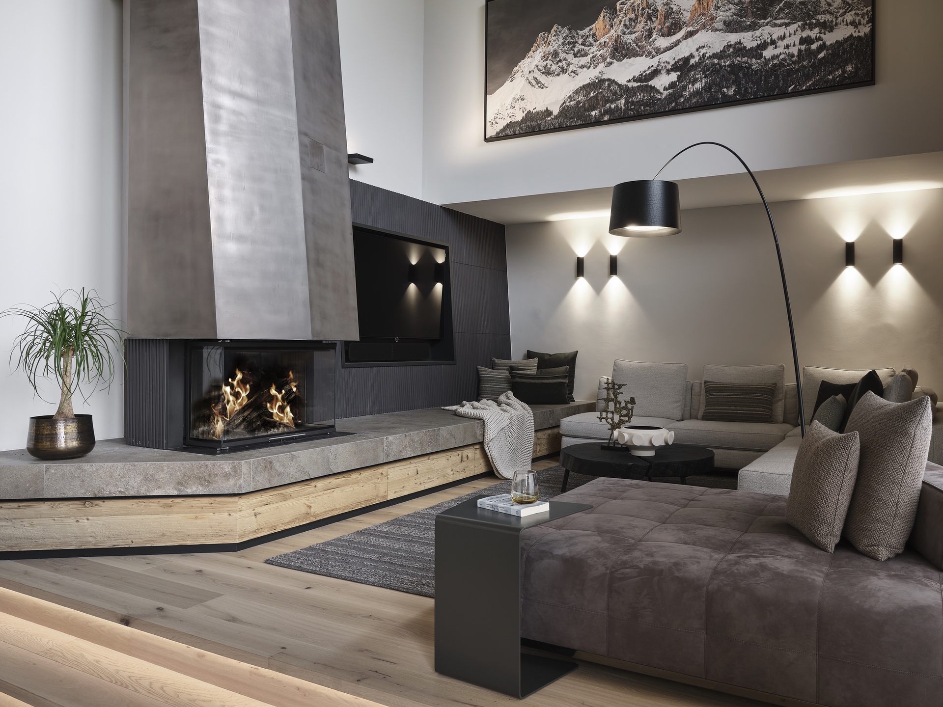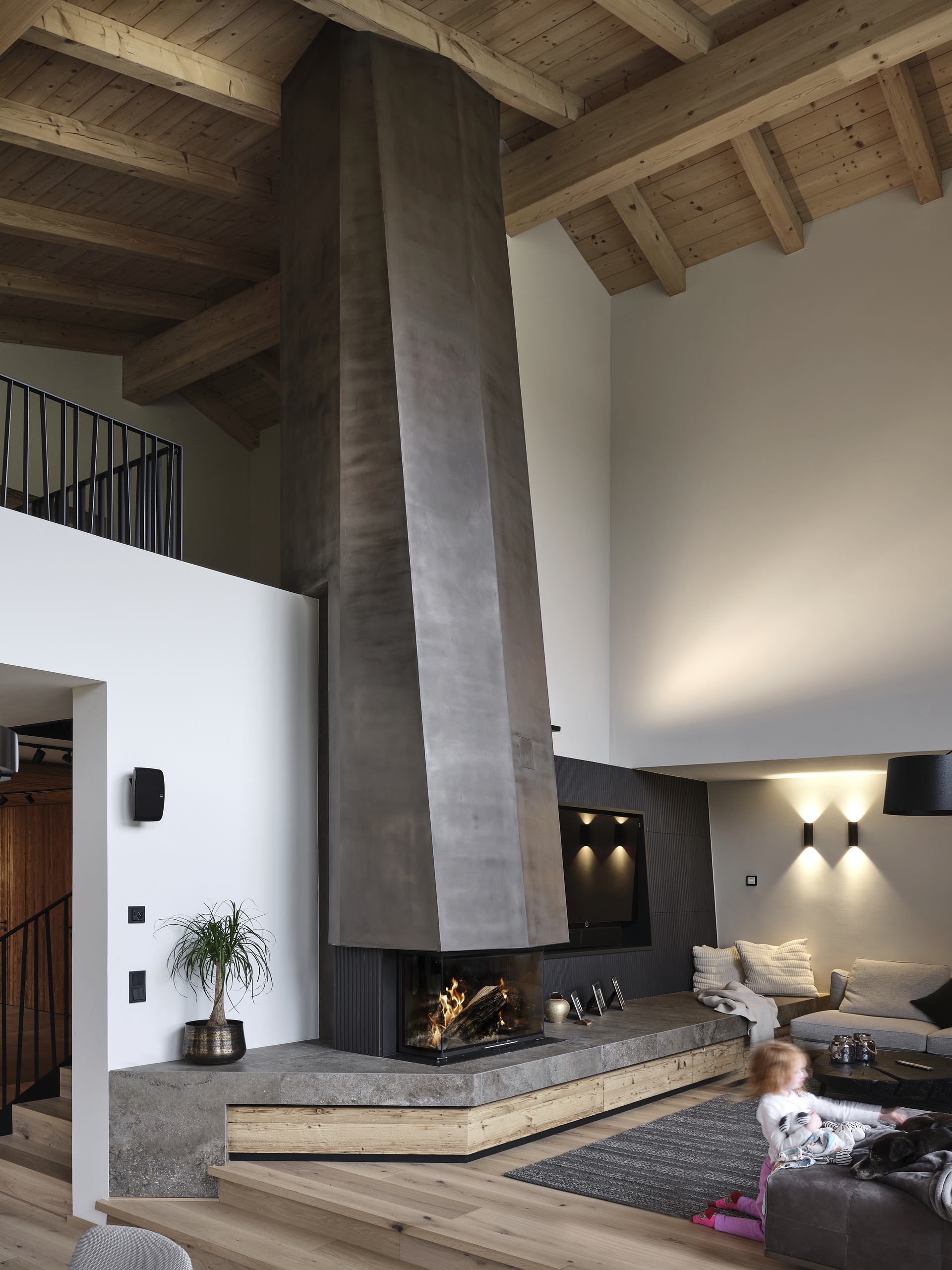 Design einer Panoramafeuerstelle über zwei Stockwerke inkl. Speicherfunktion, um auch die wohlige