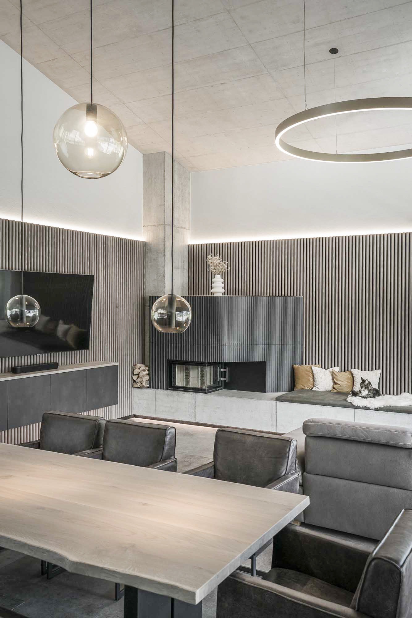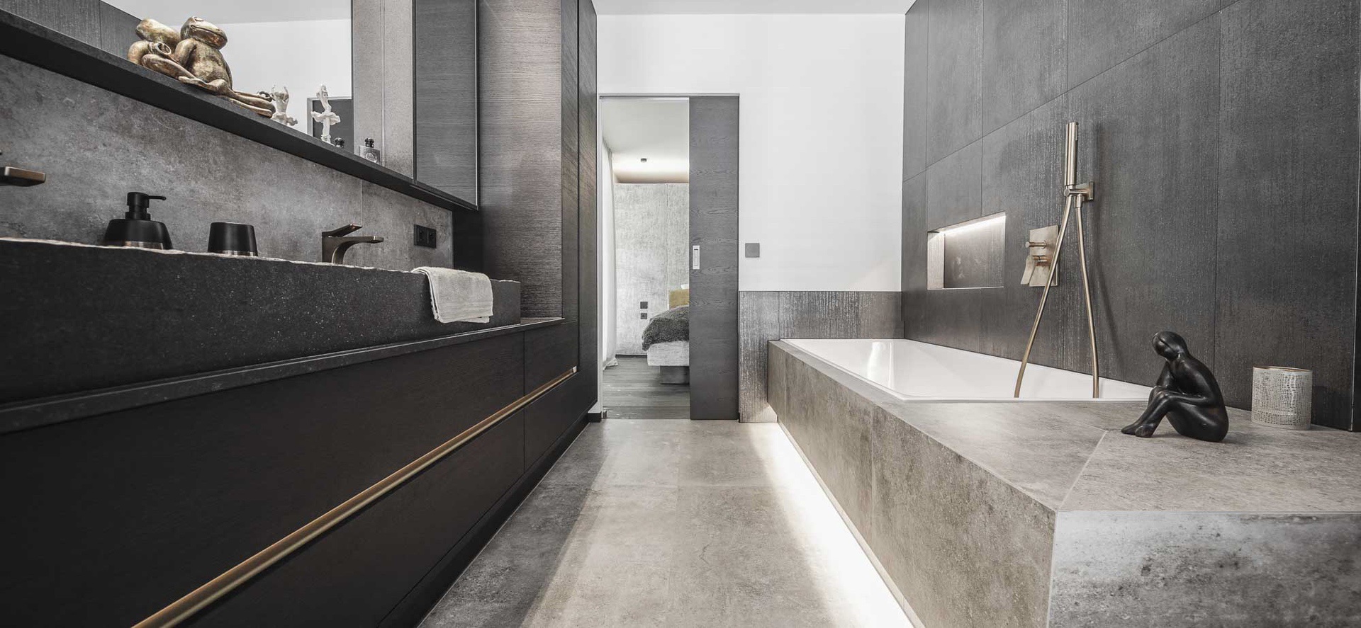 Ein wunderschönes, modernes Gebäude mitten im Innergebirge, das mit dunklen Leder, Keramik und Steinmaterial einen leichten mystischen, aber sehr gemütlichen Charakter als Designsprache wiedergibt.