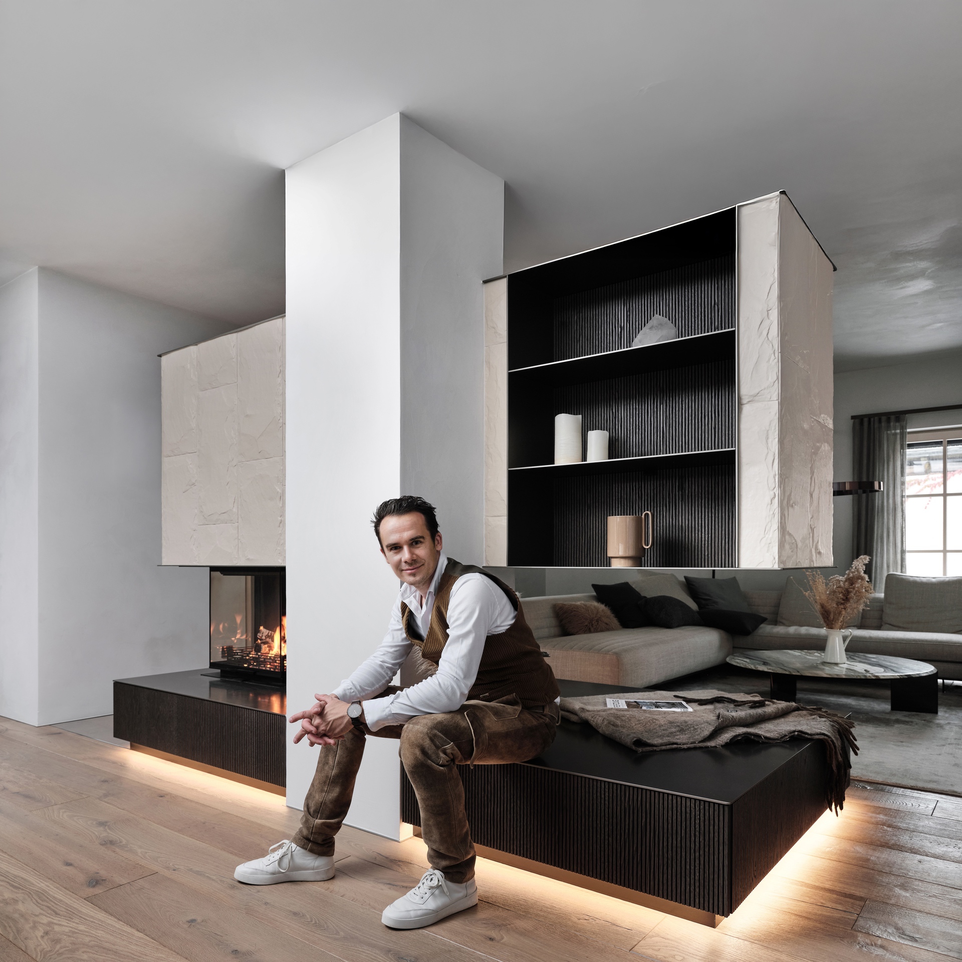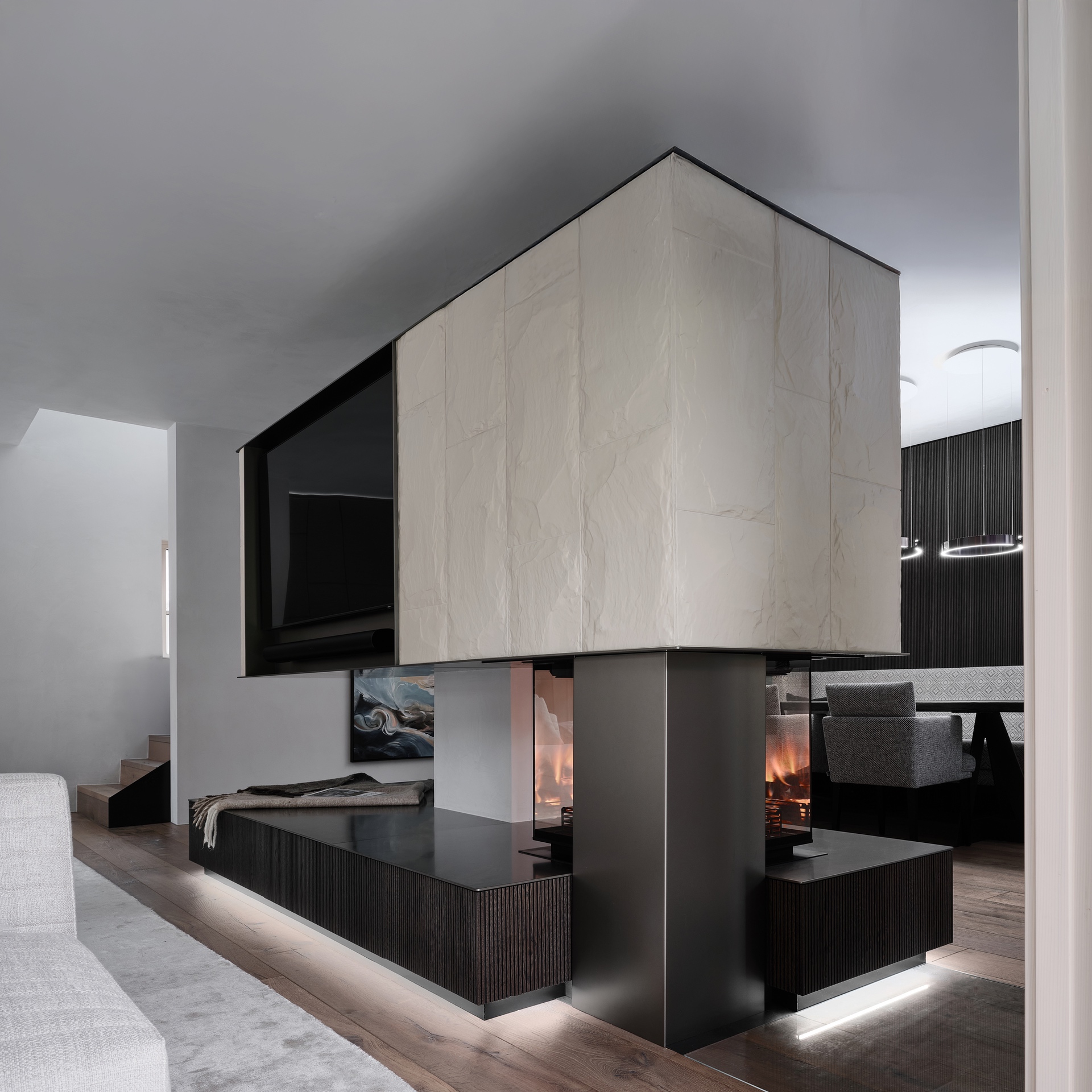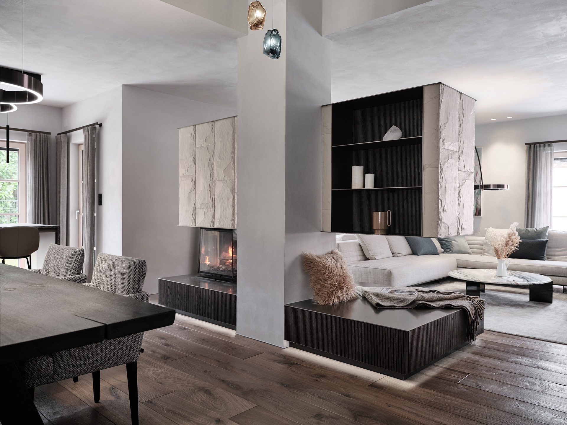 Die Stadtwohnung in Salzburg blickt schön auf die Bergspitzen des Innergebirges und genau das war die Designüberleitung, wo der geprägte Felsabdruck im schicken Carraraweiß und die elegante Mooreiche ein Meisterstück des Feuerspiels ergeben