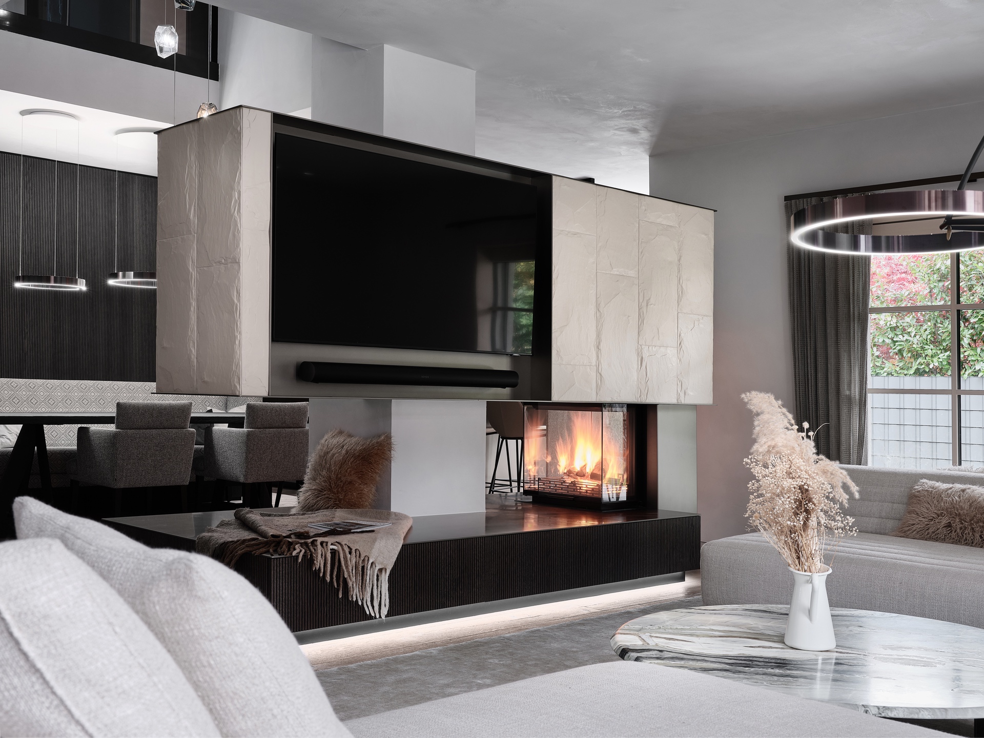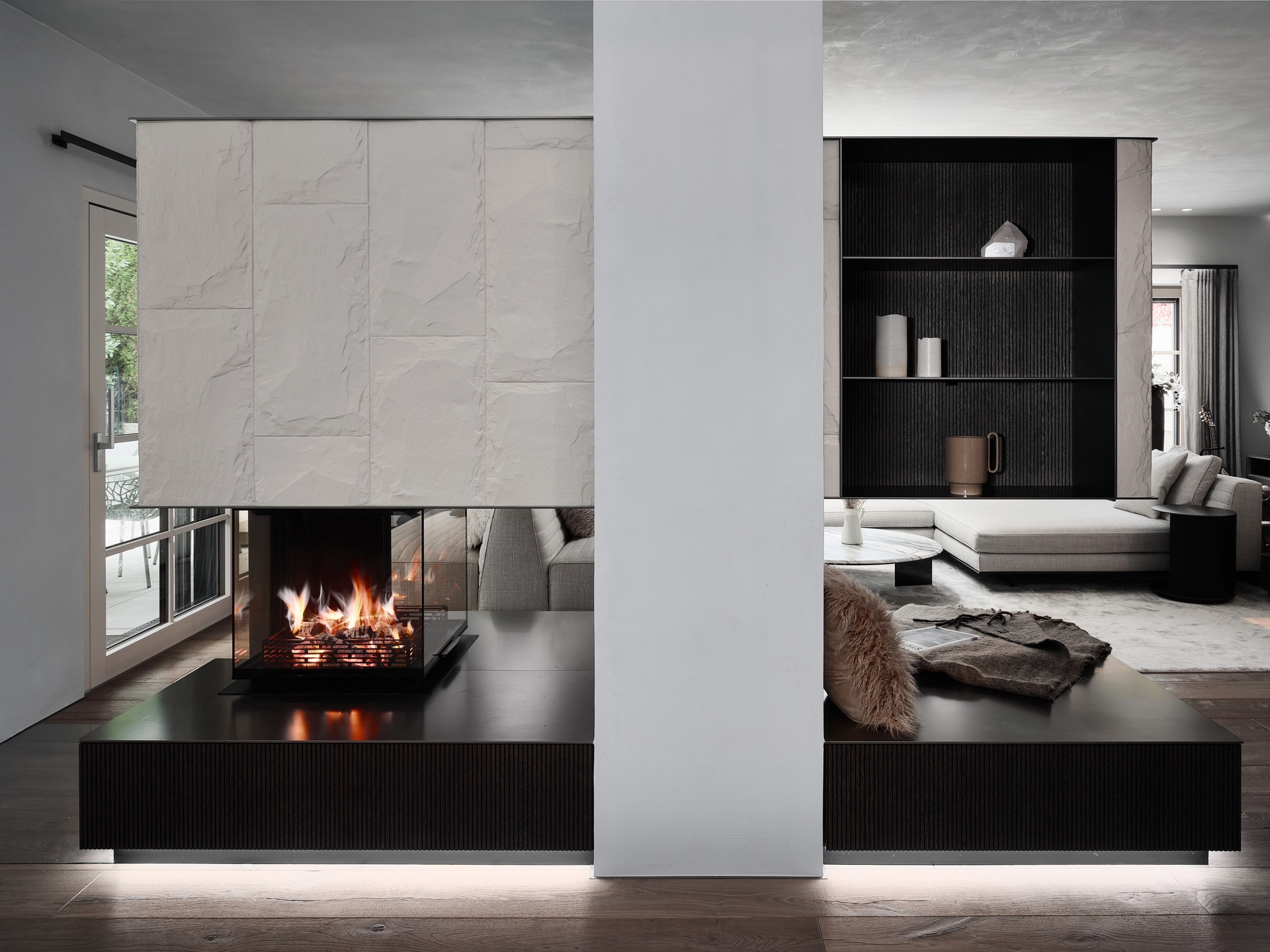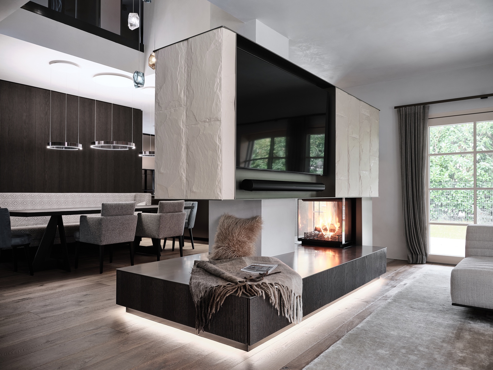 Die Stadtwohnung in Salzburg blickt schön auf die Bergspitzen des Innergebirges und genau das war die Designüberleitung, wo der geprägte Felsabdruck im schicken Carraraweiß und die elegante Mooreiche ein Meisterstück des Feuerspiels ergeben