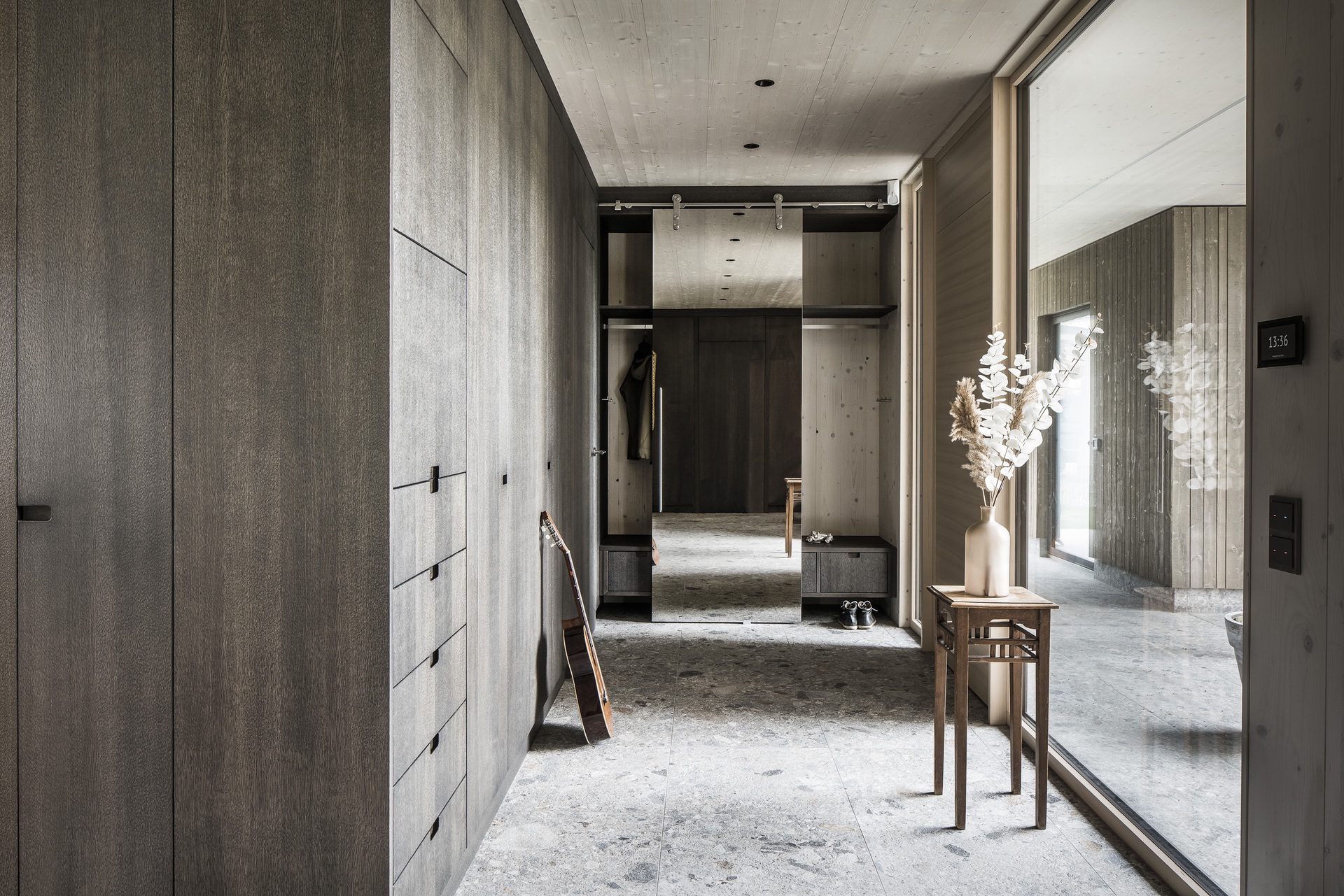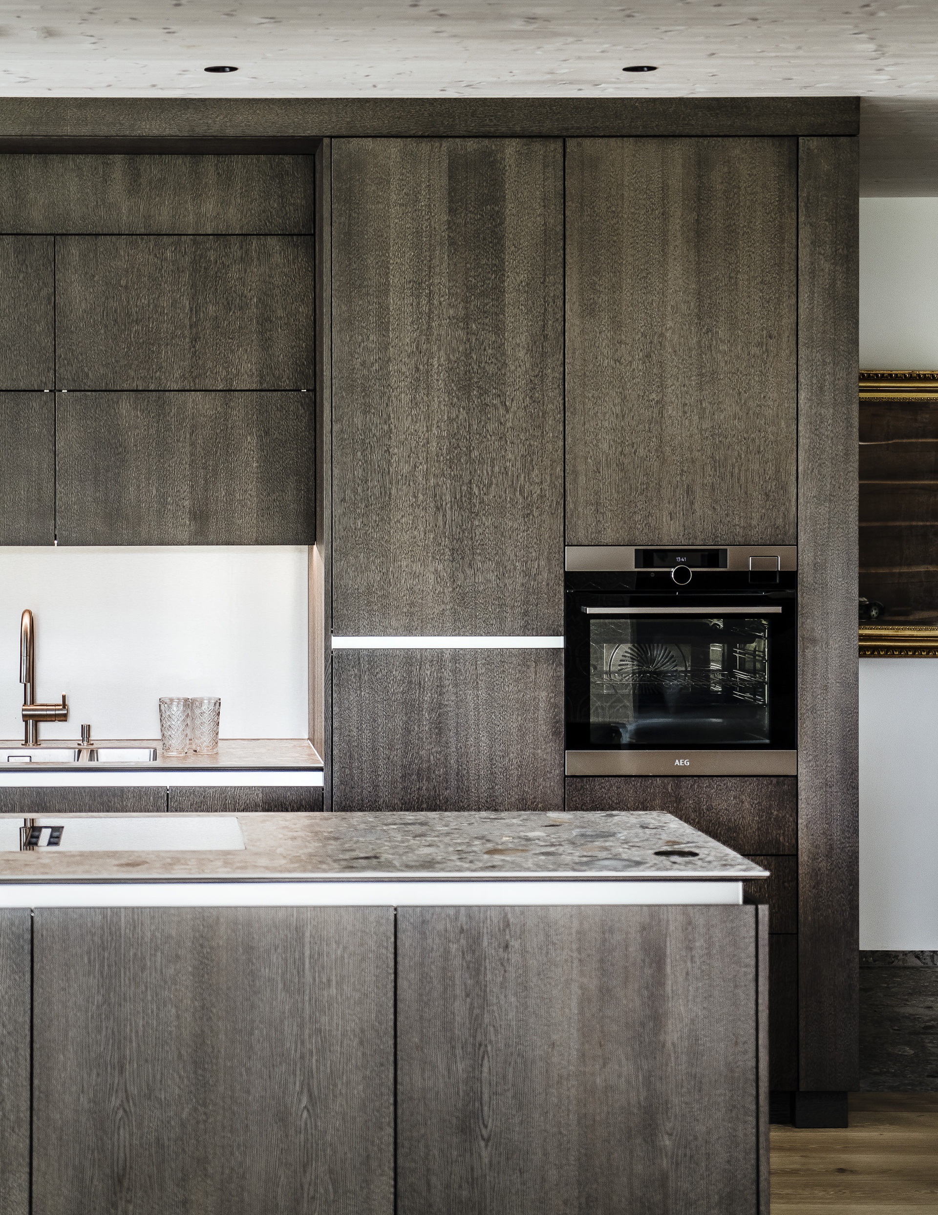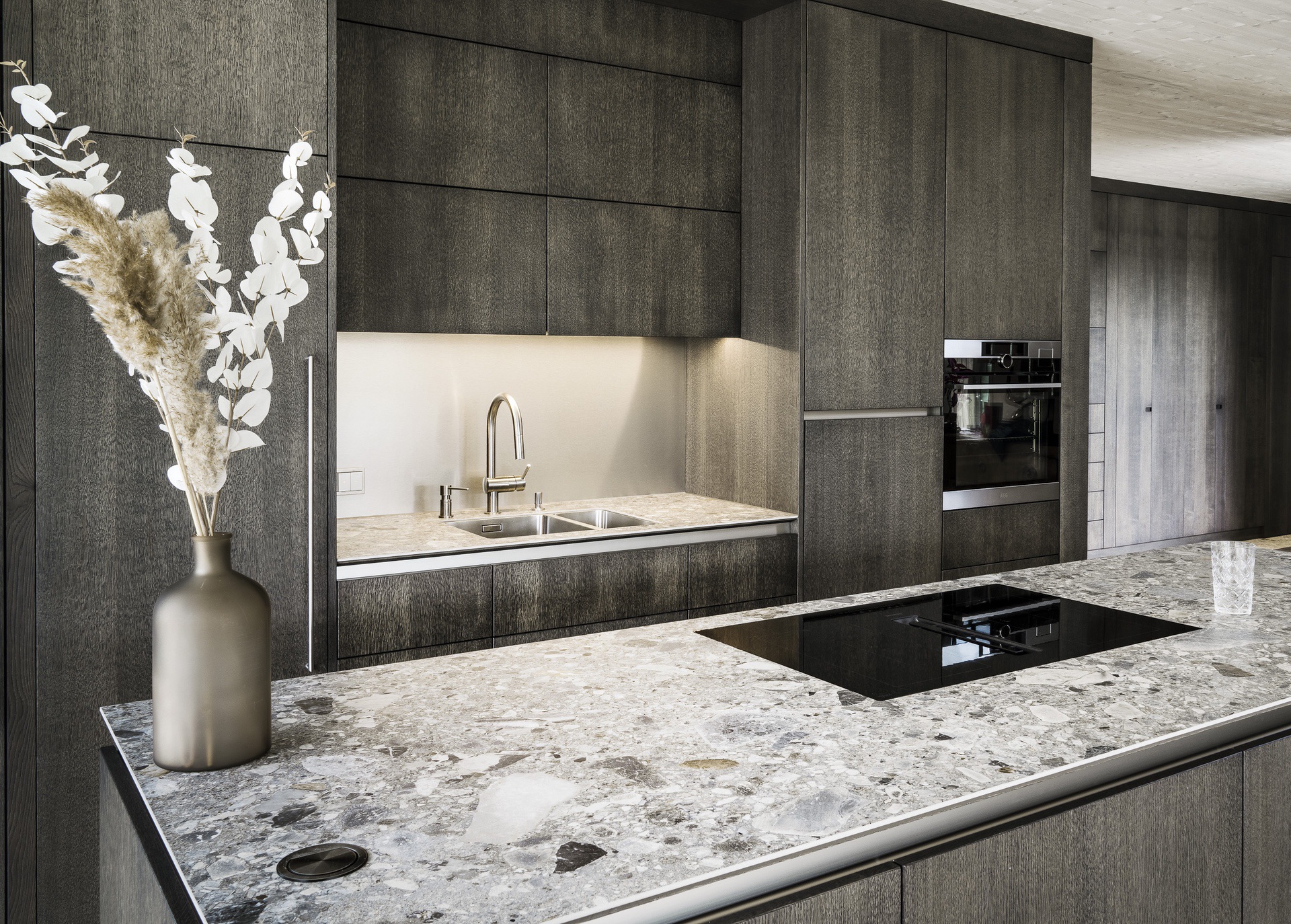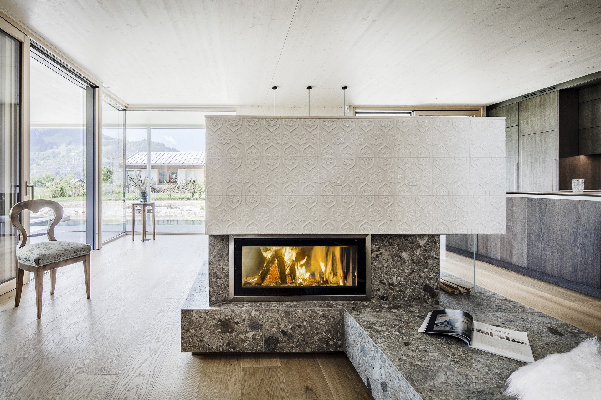 Mitten in der Stadt Saalfelden jedoch rundum im Grünen lässt sich von der gemütlichen Ofen-Couch-Kombination direkt auf den Gartenteich blicken und genauso umgekehrt das Flammenbild beim Baden im Sonnenuntergang beobachten. Die funktionale Küchen und Backkitchen-Lösung erzeugt mit Champagner-färbigen Griffen und der schönen Ceppo Steinoberfläche ein Gesamtkonzept mit Stil.